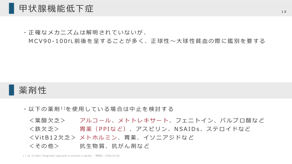 #18. 甲状腺機能低下症 18 ・正確なメカニズムは解明されていないが、 MCV90-100fL前後を呈することが多く、正球性〜⼤球性貧⾎の際に鑑別を要する 薬剤性 ・ 以 下 の 薬 剤 1)を 使 ⽤ し て い る 場 合 は 中 ⽌ を 検 討 す る <葉酸⽋乏> アルコール、メトトレキサート、フェニトイン、バルプロ酸など <鉄⽋乏> 胃薬(PPIなど)、アスピリン、NSAIDs、ステロイドなど <VitB12⽋乏> メトホルミン、胃薬、イソニアジドなど <その他> 抗⽣物質、抗がん剤など 1)Up To Date『Diagnostic approach to anemia in adults』 閲覧⽇︓2025/01/02