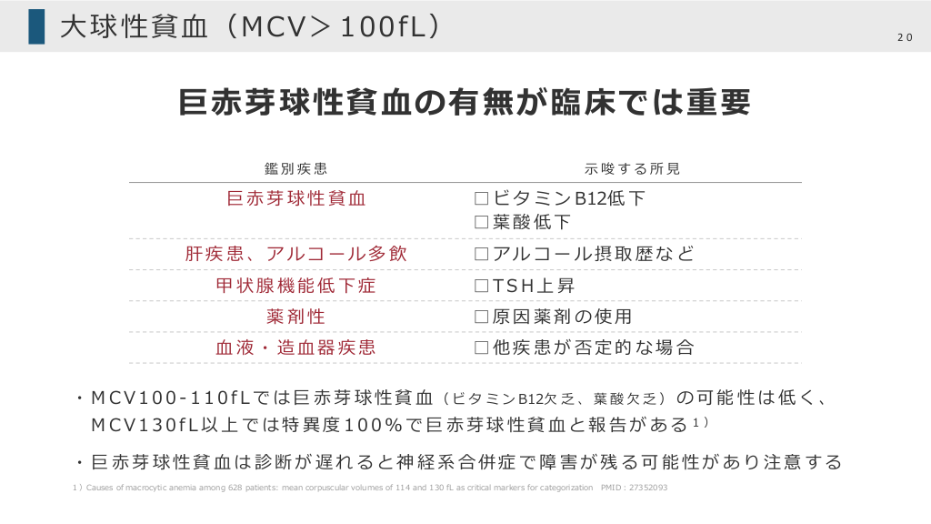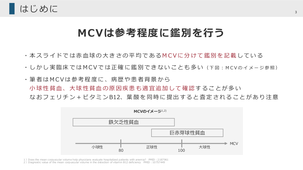 #3. はじめに 3 MCVは参考程度に鑑別を⾏う ・本スライドでは⾚⾎球の⼤きさの平均であるMCVに分けて鑑別を記載している ・しかし実臨床ではMCVでは正確に鑑別できないことも多い(下図︓MCVのイメージ参照) ・筆者はMCVは参考程度に、病歴や患者背景から ⼩球性貧⾎、⼤球性貧⾎の原因疾患も適宜追加して確認することが多い な お フ ェ リ チ ン + ビ タ ミ ン B12、 葉 酸 を 同 時 に 提 出 す る と 査 定 さ れ る こ と が あ り 注 意 MCVのイメージ1,2) 鉄⽋乏性貧⾎ 巨⾚芽球性貧⾎ ⼩球性 80 正球性 1)Does the mean corpuscular volume help physicians evaluate hospitalized patients with anemia? PMID︓2187961 2)Diagnostic value of the mean corpuscular volume in the detection of vitamin B12 deficiency PMID︓10757449 100 ⼤球性 MCV