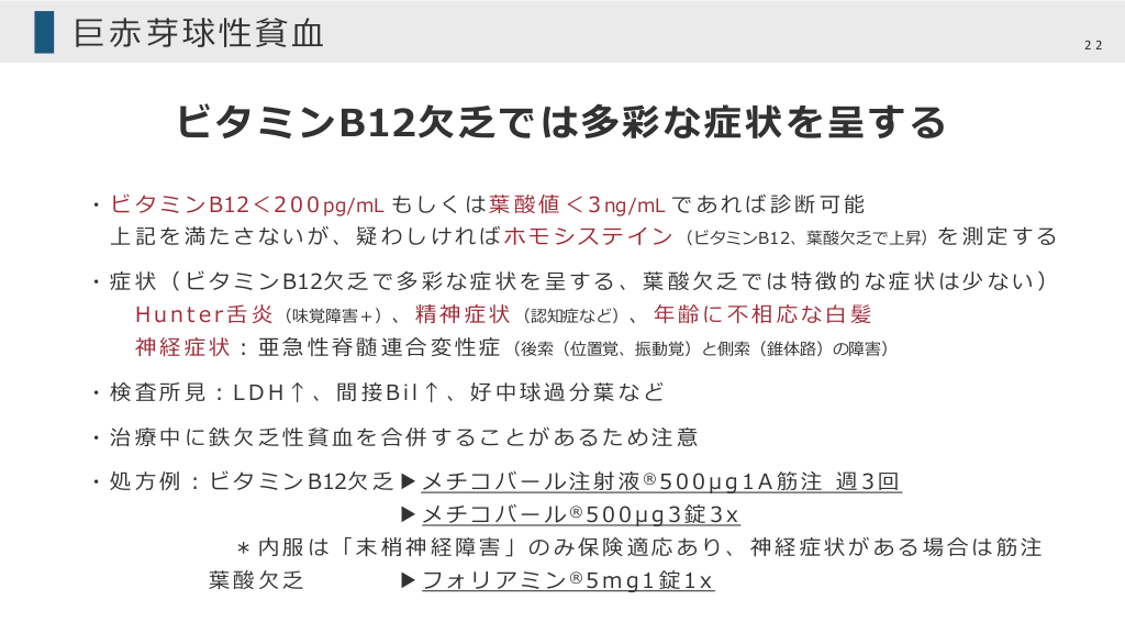 #22. 巨⾚芽球性貧⾎ 22 ビタミンB12⽋乏では多彩な症状を呈する ・ ビ タ ミ ン B12< 2 0 0 pg/mL も し く は 葉 酸 値 < 3 ng/mL で あ れ ば 診 断 可 能 上 記 を 満 た さ な い が 、 疑 わ し け れ ば ホ モ シ ス テ イ ン (ビタミンB12、葉酸⽋乏で上昇)を 測 定 す る ・ 症 状 ( ビ タ ミ ン B12⽋ 乏 で 多 彩 な 症 状 を 呈 す る 、 葉 酸 ⽋ 乏 で は 特 徴 的 な 症 状 は 少 な い ) H u n t e r ⾆ 炎 (味覚障害+)、 精 神 症 状 (認知症など)、 年 齢 に 不 相 応 な ⽩ 髪 神 経 症 状 ︓ 亜 急 性 脊 髄 連 合 変 性 症 (後索(位置覚、振動覚)と側索(錐体路)の障害) ・検査所⾒︓LDH↑、間接Bil↑、好中球過分葉など ・治療中に鉄⽋乏性貧⾎を合併することがあるため注意 ・ 処 ⽅ 例 ︓ ビ タ ミ ン B12⽋ 乏 ▶ メ チ コ バ ー ル 注 射 液 ® 5 0 0 μ g 1 A 筋 注 週 3 回 ▶ メ チ コ バ ー ル ®5 0 0 μ g 3 錠 3 x *内服は「末梢神経障害」のみ保険適応あり、神経症状がある場合は筋注 葉酸⽋乏 ▶ フ ォ リ ア ミ ン ®5 m g 1 錠 1 x