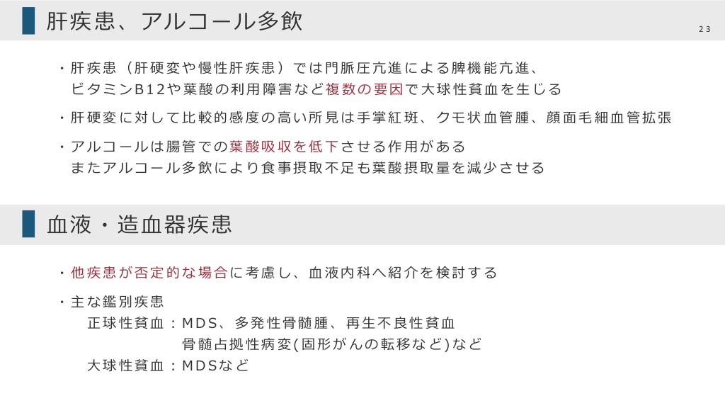 #23. 肝疾患、アルコール多飲 ・肝疾患(肝硬変や慢性肝疾患)では⾨脈圧亢進による脾機能亢進、 ビタミンB12や葉酸の利⽤障害など複数の要因で⼤球性貧⾎を⽣じる ・肝硬変に対して⽐較的感度の⾼い所⾒は⼿掌紅斑、クモ状⾎管腫、顔⾯⽑細⾎管拡張 ・アルコールは腸管での葉酸吸収を低下させる作⽤がある またアルコール多飲により⾷事摂取不⾜も葉酸摂取量を減少させる ⾎液・造⾎器疾患 ・他疾患が否定的な場合に考慮し、⾎液内科へ紹介を検討する ・主な鑑別疾患 正球性貧⾎︓MDS、多発性⾻髄腫、再⽣不良性貧⾎ ⾻髄占拠性病変(固形がんの転移など)など ⼤球性貧⾎︓MDSなど 23