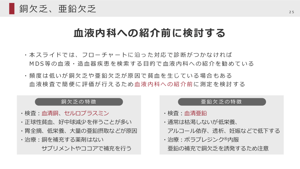 #25. 銅⽋乏、亜鉛⽋乏 25 ⾎液内科への紹介前に検討する ・本スライドでは、フローチャートに沿った対応で診断がつかなければ MDS等の⾎液・造⾎器疾患を検索する⽬的で⾎液内科への紹介を勧めている ・頻度は低いが銅⽋乏や亜鉛⽋乏が原因で貧⾎を⽣じている場合もある ⾎液検査で簡便に評価が⾏えるため⾎液内科への紹介前に測定を検討する 銅⽋乏の特徴 亜鉛⽋乏の特徴 ・検査︓⾎清銅、セルロプラスミン ・検査︓⾎清亜鉛 ・正球性貧⾎、好中球減少を伴うことが多い ・通常は枯渇しないが低栄養、 ・胃全摘、低栄養、⼤量の亜鉛摂取などが原因 ・治療︓銅を補充する薬剤はない サプリメントやココアで補充を⾏う アルコール依存、透析、妊娠などで低下する ・治療︓ポラプレジンク®内服 亜鉛の補充で銅⽋乏を誘発するため注意
