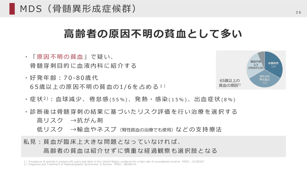 #26. MDS(⾻髄異形成症候群) 26 ⾼齢者の原因不明の貧⾎として多い ・「原因不明の貧⾎」で疑い、 ⾻髄穿刺⽬的に⾎液内科に紹介する ・好発年齢︓70-80歳代 65歳以上の 貧⾎の原因1) 6 5 歳 以 上 の 原 因 不 明 の 貧 ⾎ の 1 / 6 を 占 め る 1) ・ 症 状 2)︓ ⾎ 球 減 少 、 倦 怠 感 ( 5 5 % ) 、 発 熱 ・ 感 染 ( 1 5 % ) 、 出 ⾎ 症 状 ( 8 % ) ・診断後は⾻髄穿刺の結果に基づいたリスク評価を⾏い治療を選択する ⾼リスク →抗がん剤 低リスク → 輸 ⾎ や ネ ス プ (腎性貧⾎の治療でも使⽤)な ど の ⽀ 持 療 法 私⾒︓貧⾎が臨床上⼤きな問題となっていなければ、 ⾼齢者の貧⾎は紹介せずに慎重な経過観察も選択肢となる 1)Prevalence of anemia in persons 65 years and older in the United States: evidence for a high rate of unexplained anemia 2)Diagnosis and Treatment of Myelodysplastic Syndromes: A Review PMID︓36066514 PMID︓15238427