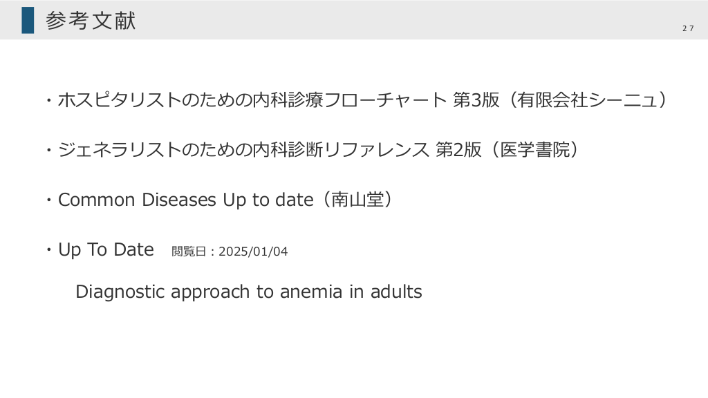 #27. 参考⽂献 27 ・ホスピタリストのための内科診療フローチャート 第3版(有限会社シーニュ) ・ジェネラリストのための内科診断リファレンス 第2版(医学書院) ・Common Diseases Up to date(南⼭堂) ・Up To Date 閲覧⽇︓2025/01/04 Diagnostic approach to anemia in adults