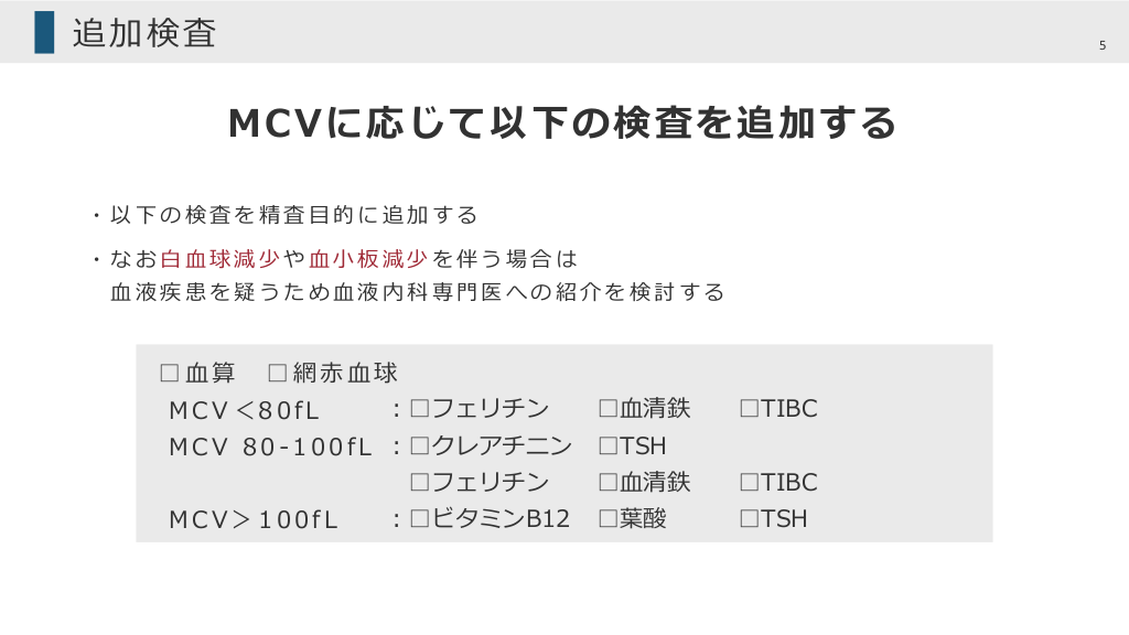 #5. 追加検査 5 MCVに応じて以下の検査を追加する ・以下の検査を精査⽬的に追加する ・なお⽩⾎球減少や⾎⼩板減少を伴う場合は ⾎液疾患を疑うため⾎液内科専⾨医への紹介を検討する □⾎算 □網⾚⾎球 MCV<80fL ︓□フェリチン M C V 8 0 - 1 0 0 f L ︓□クレアチニン □フェリチン MCV>100fL ︓□ビタミンB12 □⾎清鉄 □TIBC □TSH □⾎清鉄 □TIBC □葉酸 □TSH