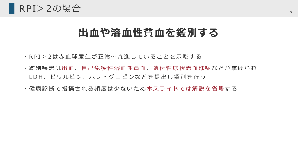 #9. RPI>2の場合 出⾎や溶⾎性貧⾎を鑑別する ・RPI>2は⾚⾎球産⽣が正常〜亢進していることを⽰唆する ・鑑別疾患は出⾎、⾃⼰免疫性溶⾎性貧⾎、遺伝性球状⾚⾎球症などが挙げられ、 LDH、ビリルビン、ハプトグロビンなどを提出し鑑別を⾏う ・健康診断で指摘される頻度は少ないため本スライドでは解説を省略する 9