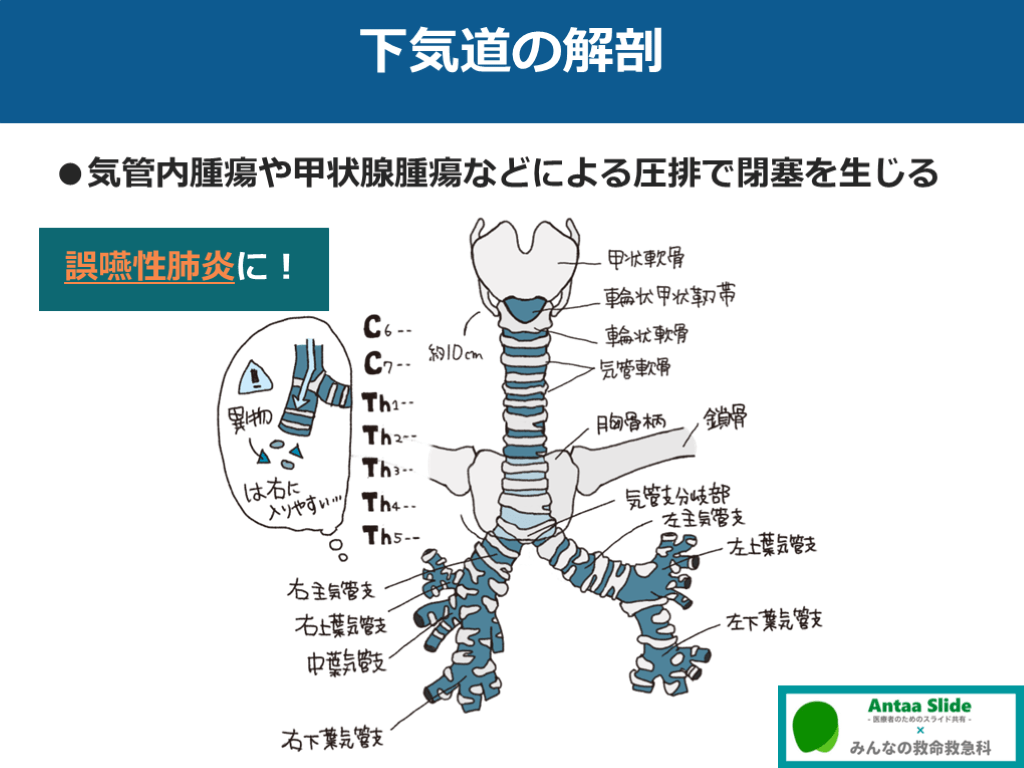 #10. 下気道の解剖 ●気管内腫瘍や甲状腺腫瘍などによる圧排で閉塞を生じる 誤嚥性肺炎に!