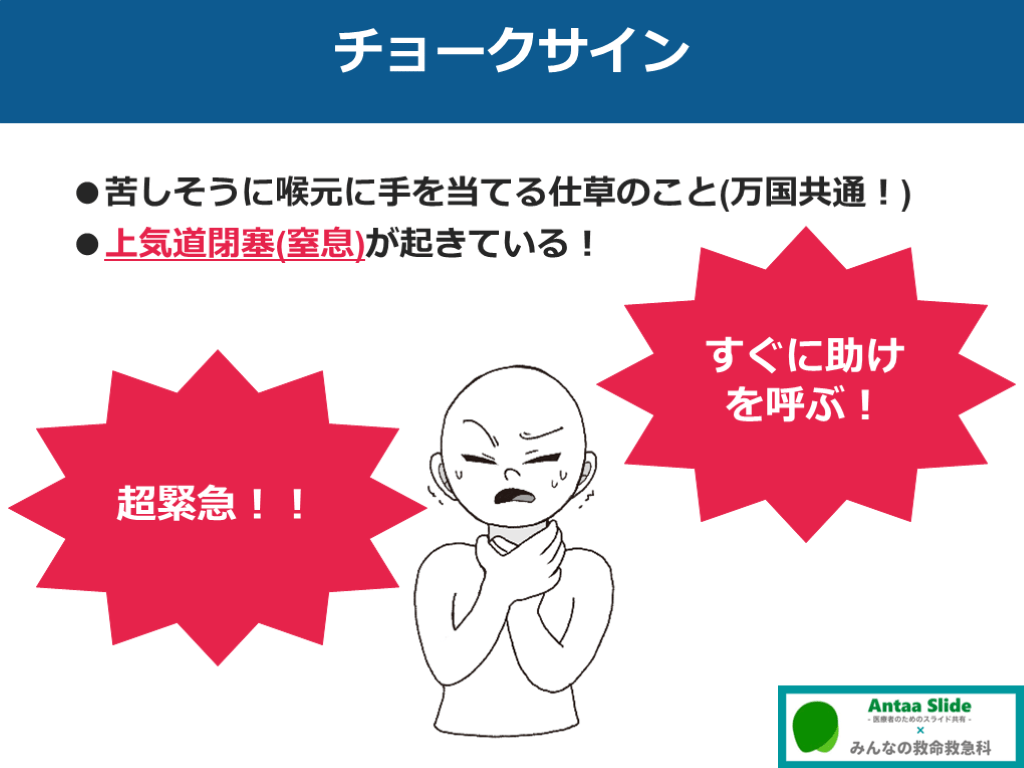 ●上気道閉塞(窒息)が起きている! 超緊急!! すぐに助けを呼ぶ!