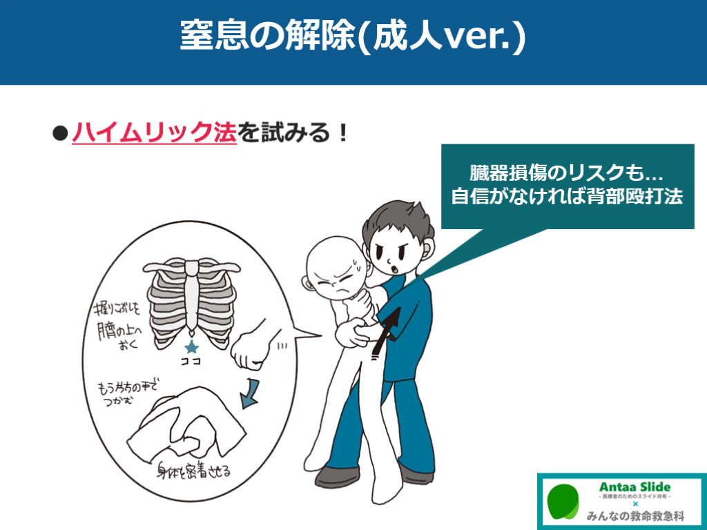 #19. 窒息の解除(成人ver.) ●ハイムリック法を試みる! 臓器損傷のリスクも…