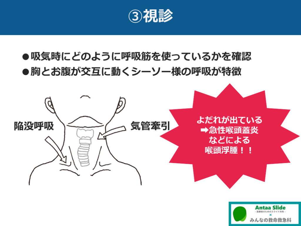 ●胸とお腹が交互に動くシーソー様の呼吸が特徴 気管牽引 陥没呼吸 よだれが出ている
