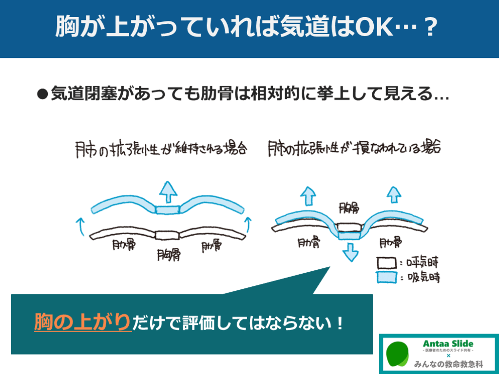 #27. 胸が上がっていれば気道はOK…? ●気道閉塞があっても肋骨は相対的に挙上して見える… 胸の上がりだけで評価してはならない!