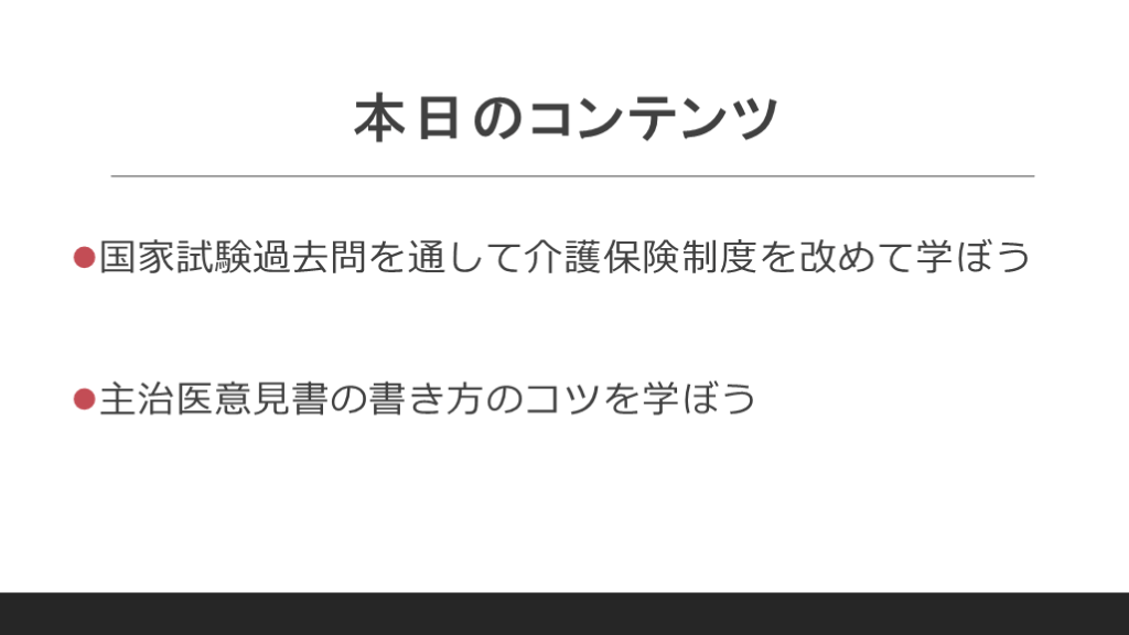 まずは医師国家試験を題材にして介護保険制度を復習します。