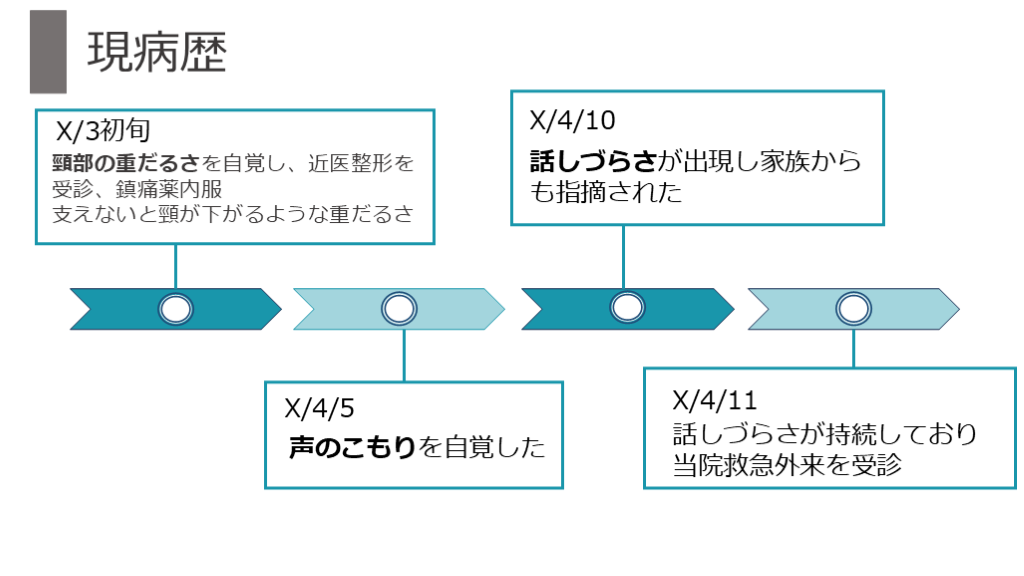#4. X/3初旬 現病歴 頸部の重だるさを自覚し、近医整形を受診、鎮痛薬内服