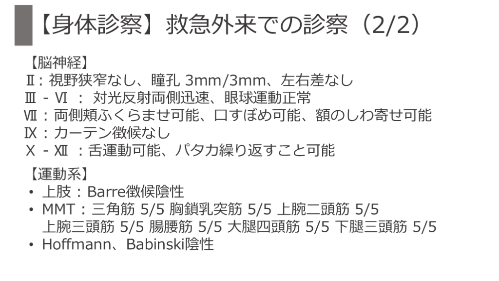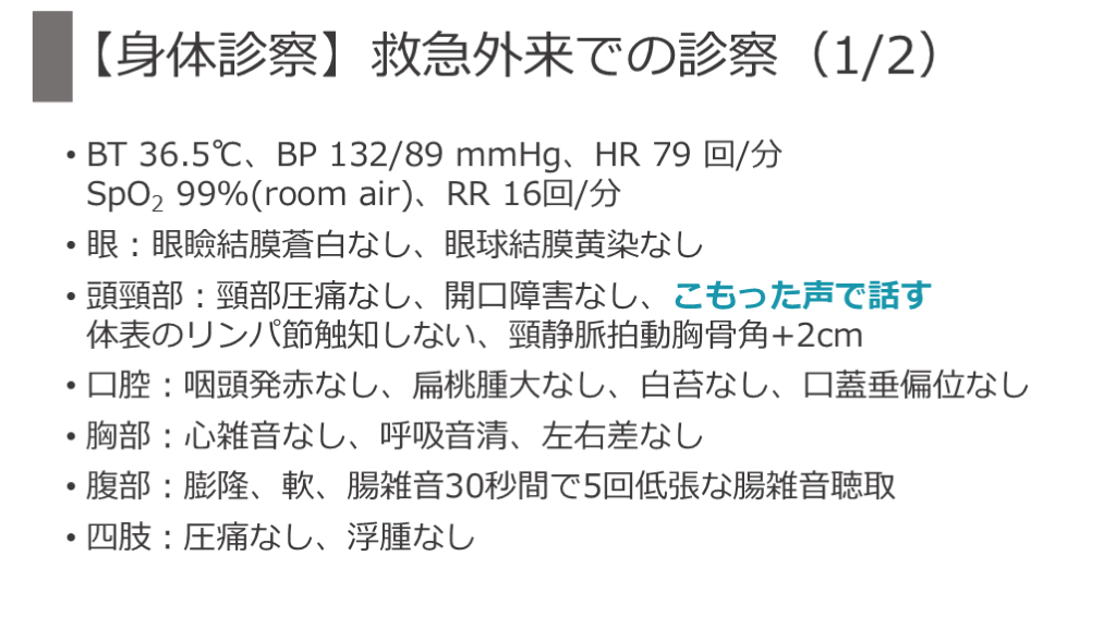 四肢:圧痛なし、浮腫なし 【身体診察】救急外来での診察(1/2)