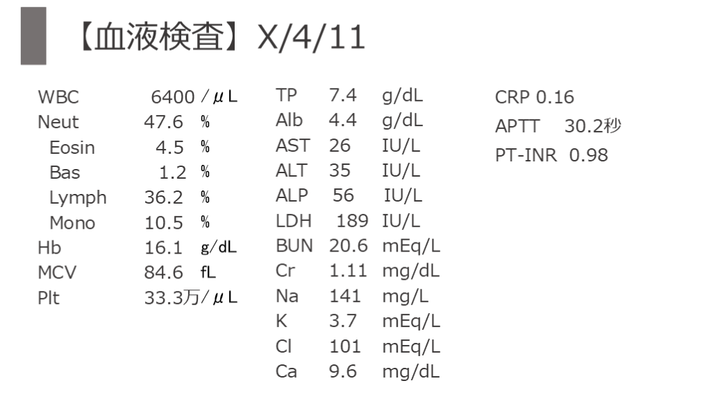 #7. 【血液検査】X/4/11 APTT 30.2秒 PT-INR 0.98