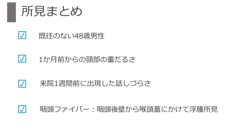 #11. 1か月前からの頸部の重だるさ 来院1週間前に出現した話しづらさ 咽頭ファイバー:咽頭後壁から喉頭蓋にかけて浮腫所見 2 所見まとめ 既往のない48歳男性 ☑ ☑ ☑ ☑