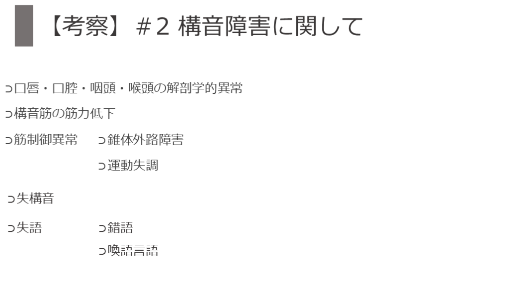 ⊃運動失調 ⊃失構音 【考察】#2 構音障害に関して ⊃失語 ⊃錯語 ⊃喚語言語