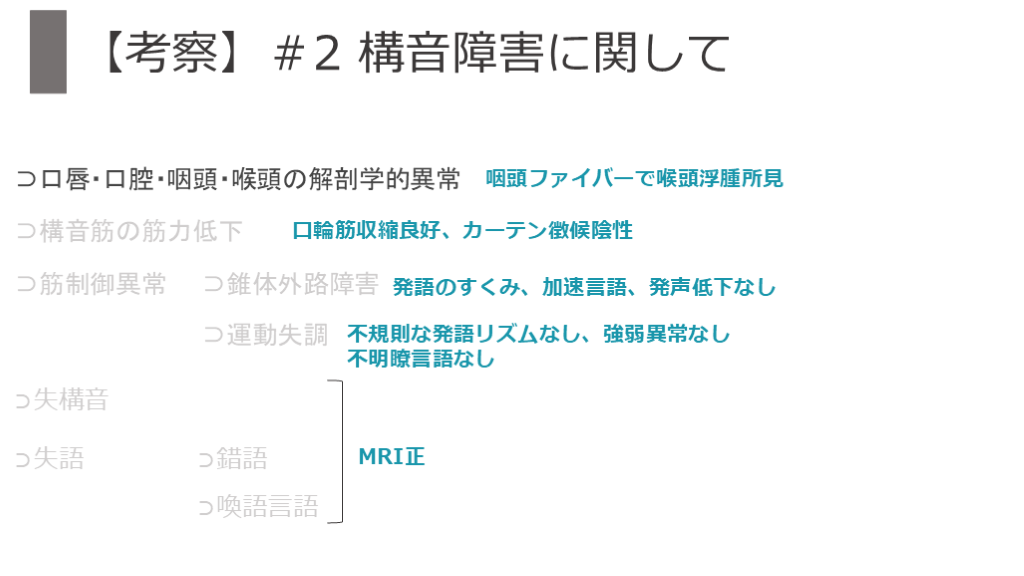 ⊃運動失調 【考察】#2 構音障害に関して 発語のすくみ、加速言語、発声低下なし 不規則な発語リズムなし、強弱異常なし