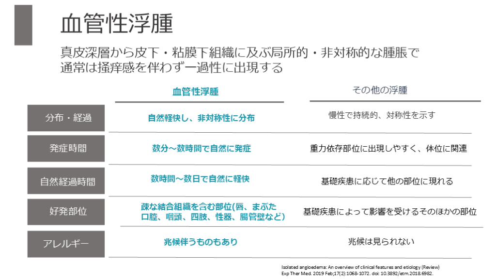 Exp Ther Med. 2019 Feb;17(2):1068-1072. doi: 10.3892/etm.2018.6982. 分布・経過 発症時間 自然経過時間 好発部位 アレルギー 血管性浮腫 その他の浮腫 自然軽快し、非対称性に分布 慢性で持続的、対称性を示す 重力依存部位に出現しやすく、体位に関連 基礎疾患に応じて他の部位に現れる