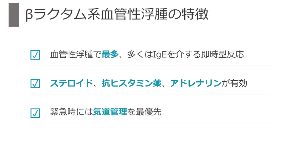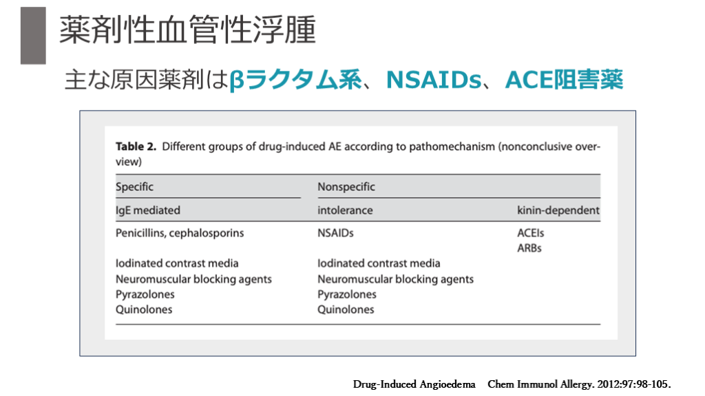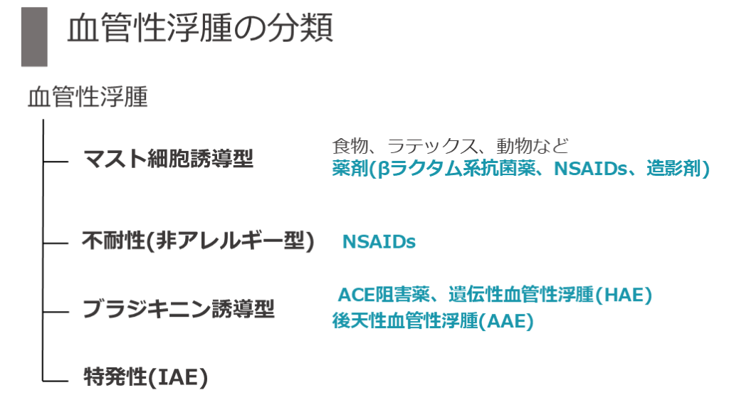 薬剤(βラクタム系抗菌薬、NSAIDs、造影剤) ACE阻害薬、遺伝性血管性浮腫(HAE)