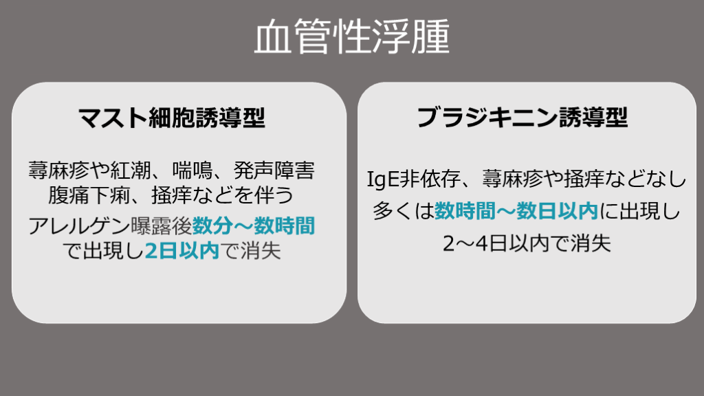 ブラジキニン誘導型 IgE非依存、蕁麻疹や掻痒などなし
