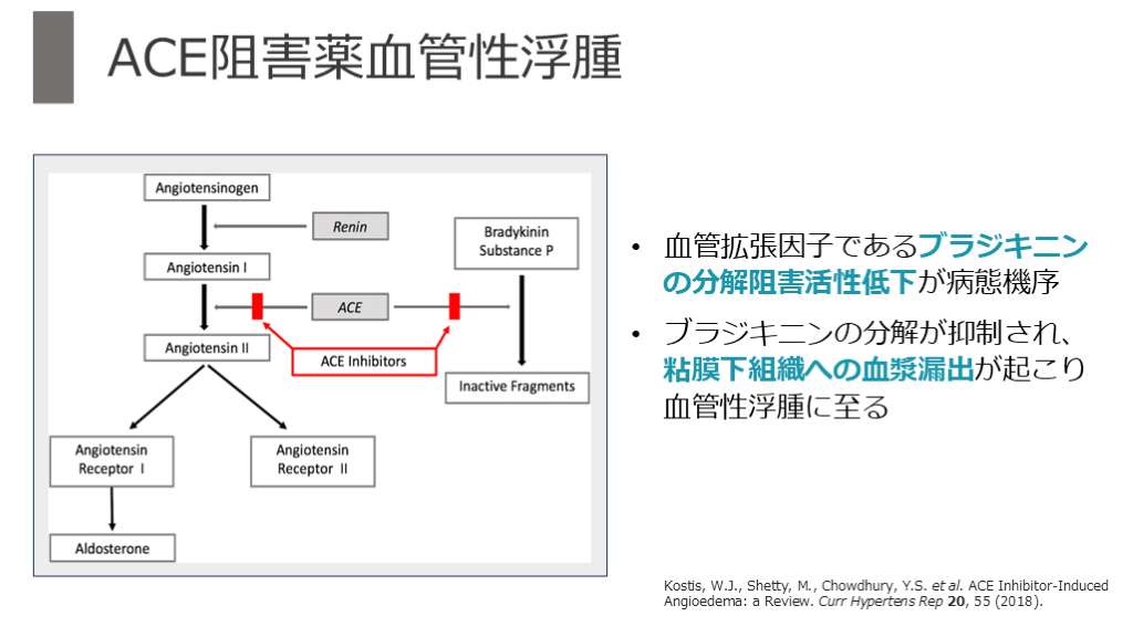 #22. ACE阻害薬血管性浮腫 Kostis, W.J., Shetty, M., Chowdhury, Y.S. et al. ACE Inhibitor-Induced Angioedema: a Review. Curr Hypertens Rep 20, 55 (2018). 血管拡張因子であるブラジキニンの分解阻害活性低下が病態機序