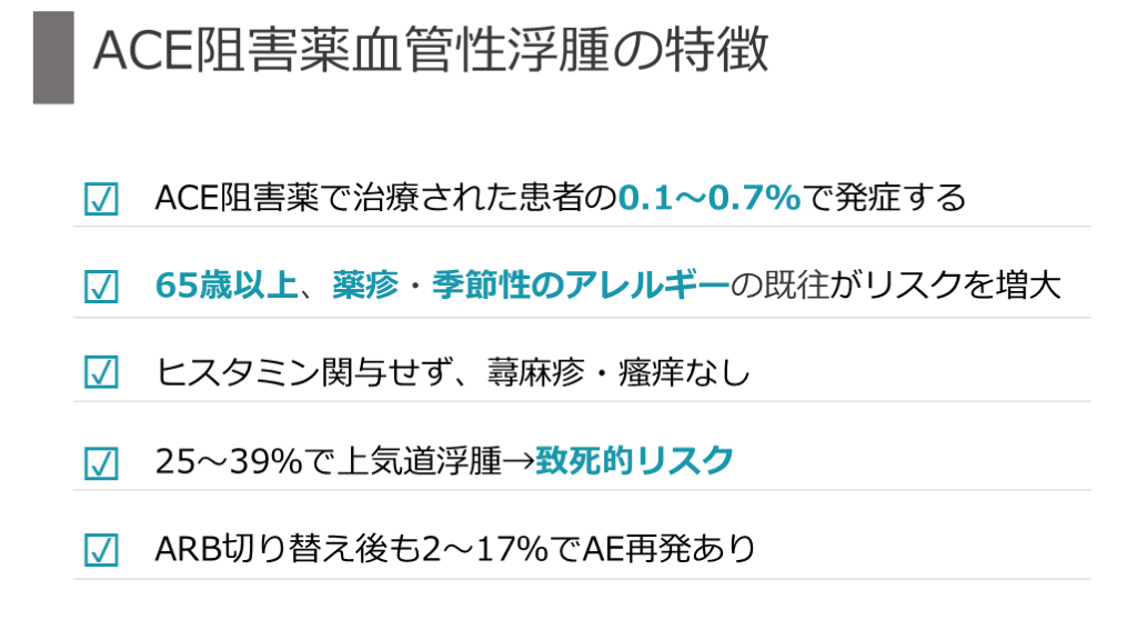 #24. ACE阻害薬血管性浮腫 使用開始後すぐから最大で数年後まで発症するため見逃されやすい