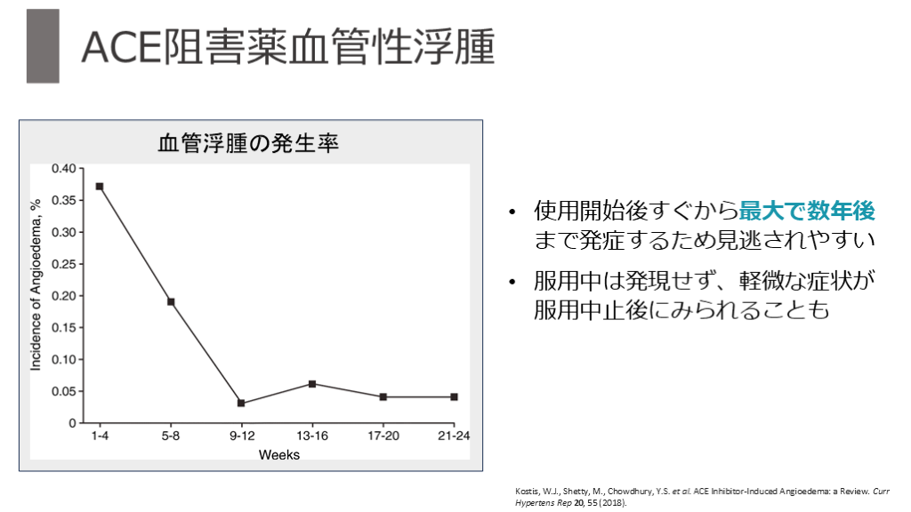 服用中は発現せず、軽微な症状が服用中止後にみられることも Kostis, W.J., Shetty, M., Chowdhury, Y.S. et al. ACE Inhibitor-Induced Angioedema: a Review. Curr Hypertens Rep 20, 55 (2018).