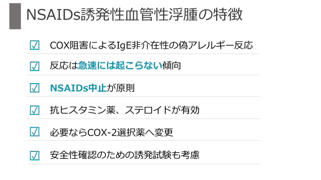 #25. NSAIDs誘発性血管性浮腫の特徴 COX阻害によるIgE非介在性の偽アレルギー反応
