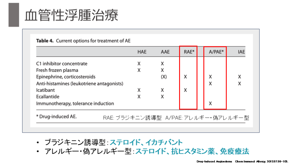 #26. 血管性浮腫治療 Drug-Induced Angioedema Chem Immunol Allergy. 2012:97:98-105. ブラジキニン誘導型:ステロイド、イカチバント