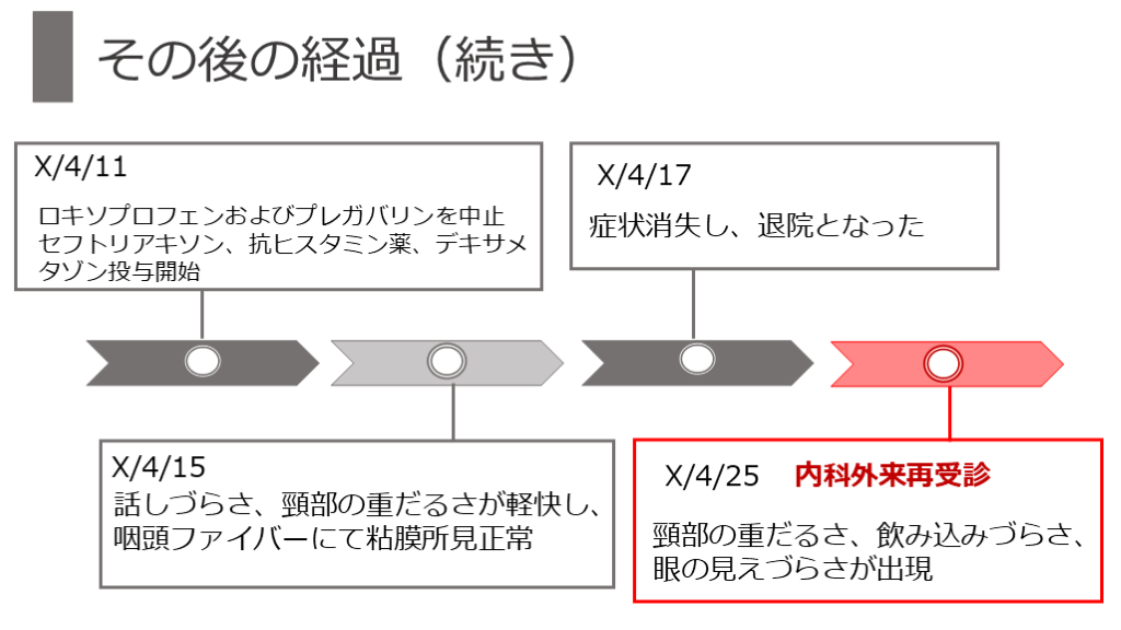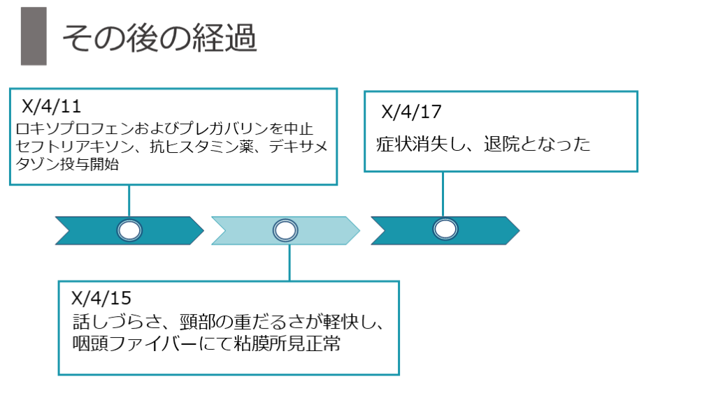 セフトリアキソン、抗ヒスタミン薬、デキサメタゾン投与開始 X/4/15 X/4/17 症状消失し、退院となった 話しづらさ、頸部の重だるさが軽快し、