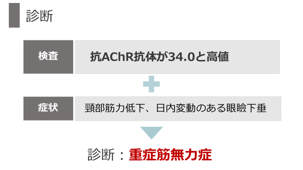 #30. 抗AChR抗体が34.0と高値 診断:重症筋無力症 診断 頸部筋力低下、日内変動のある眼瞼下垂 症状 検査