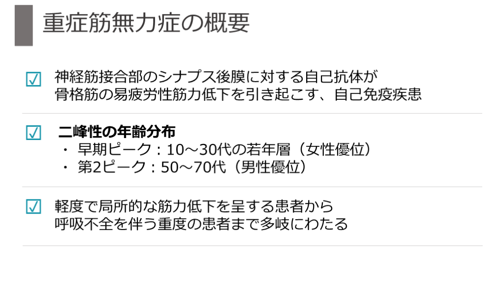 #31. 【その後の経過】 神経筋接合部のシナプス後膜に対する自己抗体が骨格筋の易疲労性筋力低下を引き起こす、自己免疫疾患 重症筋無力症の概要 ☑ ☑ ☑ 二峰性の年齢分布