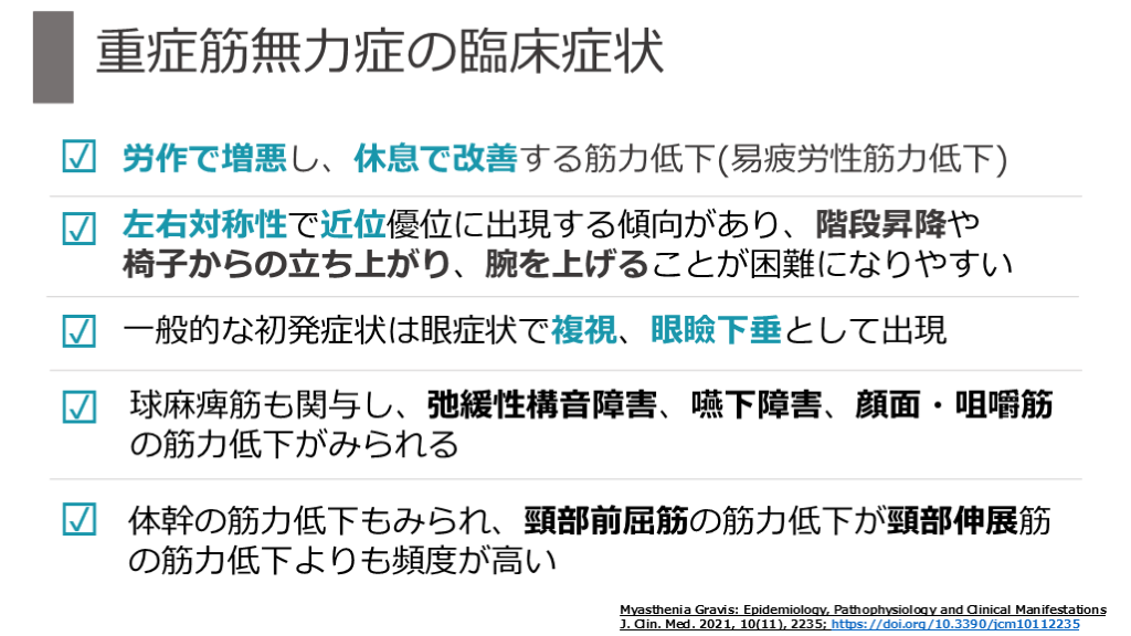 椅子からの立ち上がり、腕を上げることが困難になりやすい 球麻痺筋も関与し、弛緩性構音障害、嚥下障害、顔面・咀嚼筋の筋力低下がみられる 労作で増悪し、休息で改善する筋力低下(易疲労性筋力低下) 一般的な初発症状は眼症状で複視、眼瞼下垂として出現 ☑ 体幹の筋力低下もみられ、頸部前屈筋の筋力低下が頸部伸展筋の筋力低下よりも頻度が高い ☑ Myasthenia Gravis: Epidemiology, Pathophysiology and Clinical Manifestations