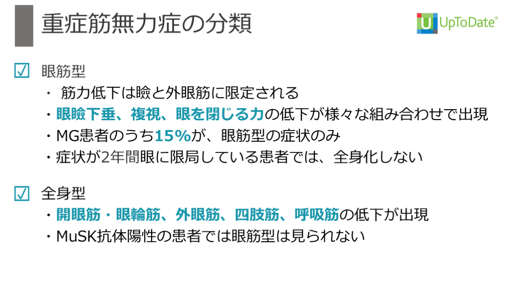 #33. 【その後の経過】 眼筋型・ 筋力低下は瞼と外眼筋に限定される・眼瞼下垂、複視、眼を閉じる力の低下が様々な組み合わせで出現・MG患者のうち15%が、眼筋型の症状のみ・症状が2年間眼に限局している患者では、全身化しない 重症筋無力症の分類 ☑ ☑ 全身型・開眼筋・眼輪筋、外眼筋、四肢筋、呼吸筋の低下が出現・MuSK抗体陽性の患者では眼筋型は見られない