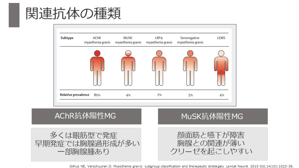 #34. 関連抗体の種類 Gilhus NE, Verschuuren JJ. Myasthenia gravis: subgroup classification and therapeutic strategies. Lancet Neurol. 2015 Oct;14(10):1023-36. AChR抗体陽性MG MuSK抗体陽性MG 多くは眼筋型で発症