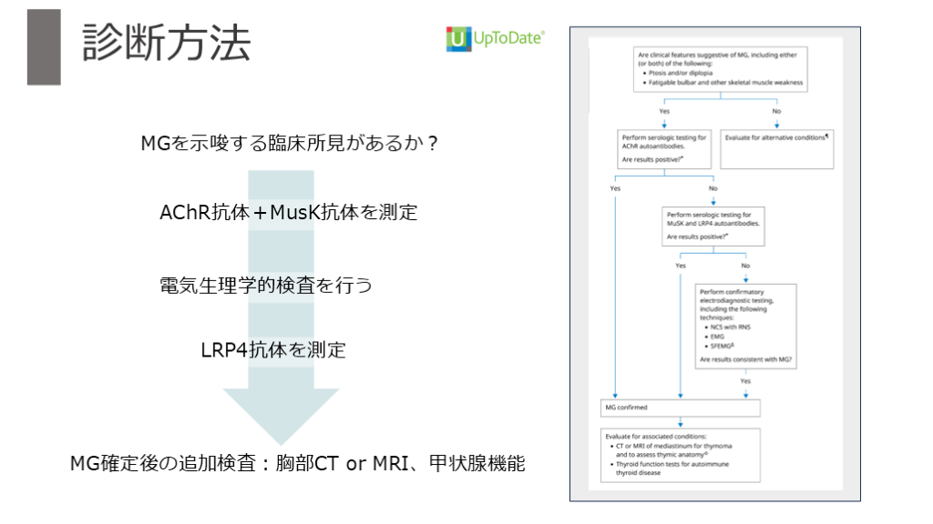 #35. 【その後の経過】 診断方法】 MGを示唆する臨床所見があるか? AChR抗体+MusK抗体を測定 電気生理学的検査を行う MG確定後の追加検査:胸部CT or MRI、甲状腺機能 LRP4抗体を測定