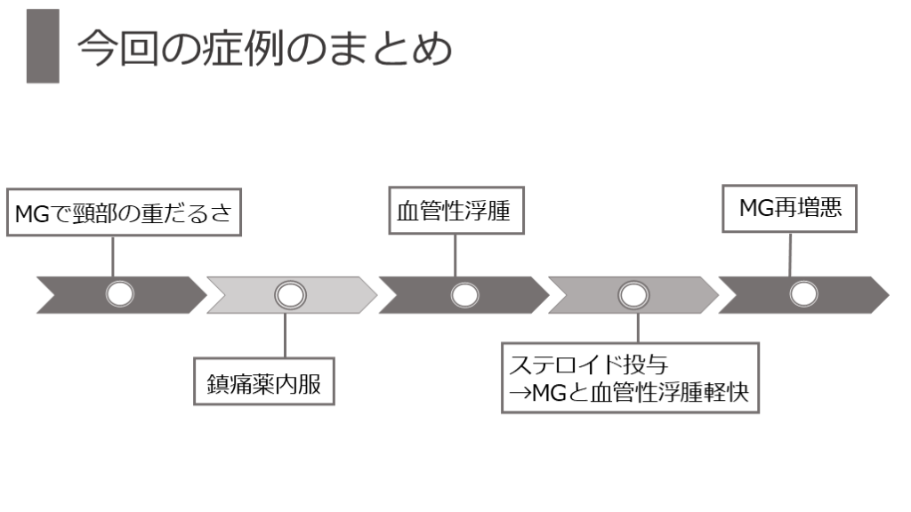 →MGと血管性浮腫軽快 鎮痛薬内服 MGで頸部の重だるさ 血管性浮腫 MG再増悪
