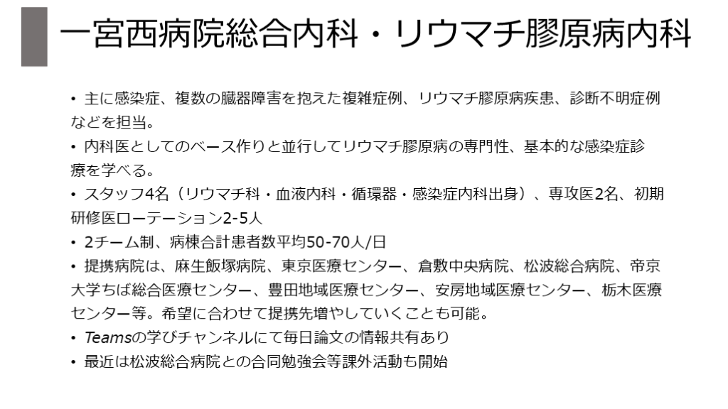 スタッフ4名(リウマチ科・血液内科・循環器・感染症内科出身)、専攻医2名、初期