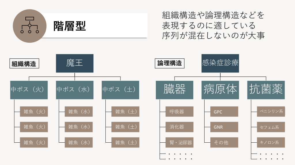 #4. 組織構造や論理構造などを 表現するのに適している 序列が混在しないのが大事 階層型 組織構造 魔王 論理構造 臓器 感染症診療 病原体 抗菌薬 中ボス(火) 中ボス(水) 中ボス(土) 雑魚(火) 雑魚(水) 雑魚(土) 呼吸器 GPC ペニシリン系 雑魚(火) 雑魚(水) 雑魚(土) 消化器 GNR セフェム系 雑魚(火) 雑魚(水) 雑魚(土) 腎・泌尿器 その他 キノロン系 ・・・・・ ・・・・・ ・・・・・ ・・・・・