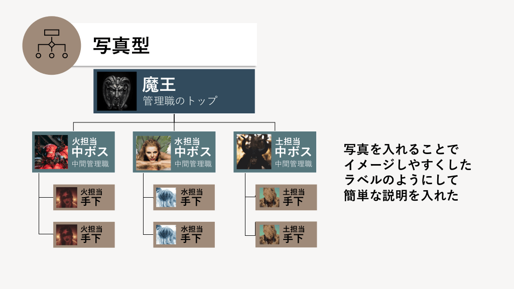 #6. 写真型 魔王 管理職のトップ 火担当 水担当 土担当 中ボス 中ボス 中ボス 中間管理職 中間管理職 中間管理職 火担当 水担当 土担当 手下 手下 手下 火担当 水担当 土担当 手下 手下 手下 写真を入れることで イメージしやすくした ラベルのようにして 簡単な説明を入れた