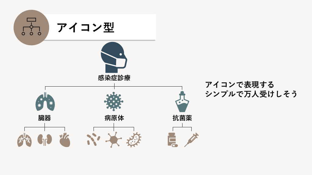 #7. アイコン型 感染症診療 臓器 病原体 アイコンで表現する シンプルで万人受けしそう 抗菌薬