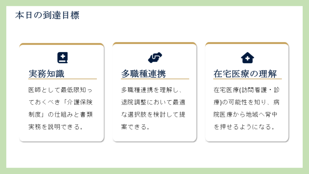 #2. 実務知識 医師として最低限知っておくべき「介護保険制度」の仕組みと書類実務を説明できる。 多職種連携 多職種連携を理解し、退院調整において最適な選択肢を検討して提案できる。 在宅医療の理解 在宅医療(訪問看護・診療)の可能性を知り、病院医療から地域へ背中を押せるようになる。 本日の到達目標