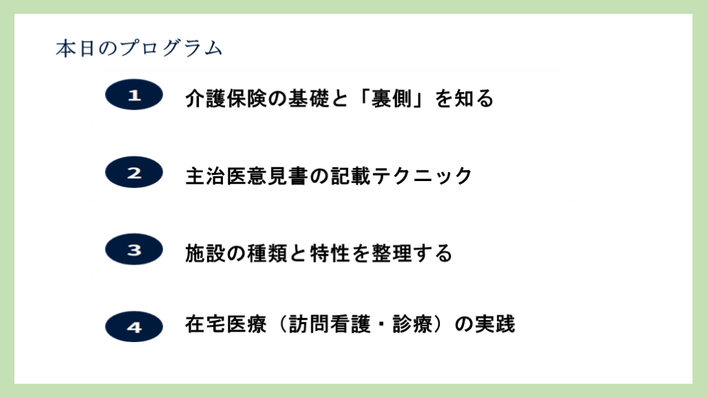 #5. 介護保険の基礎と「裏側」を知る 主治医意見書の記載テクニック 施設の種類と特性を整理する 在宅医療(訪問看護・診療)の実践 本日のプログラム
