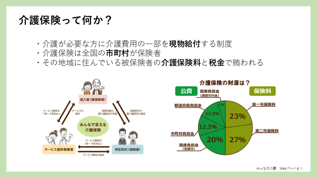 #7. 介護保険って何か? みんなの介護 Webページより ・介護が必要な方に介護費用の一部を現物給付する制度
