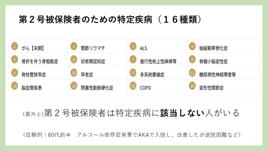 #11. (自験例:60代前半 アルコール依存症背景でAKAで入院し、改善したが退院困難など) 第2号被保険者のための特定疾病(16種類) (意外と)第2号被保険者は特定疾病に該当しない人がいる