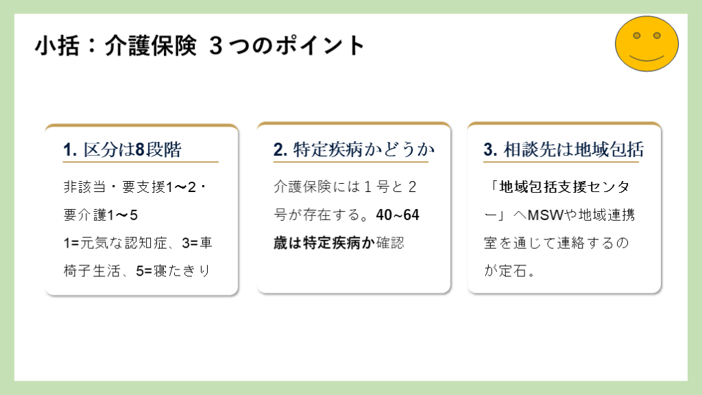 1=元気な認知症、3=車椅子生活、5=寝たきり 2. 特定疾病かどうか 介護保険には1号と2号が存在する。40~64歳は特定疾病か確認 3. 相談先は地域包括 「地域包括支援センター」へMSWや地域連携室を通じて連絡するのが定石。 小括:介護保険 3つのポイント