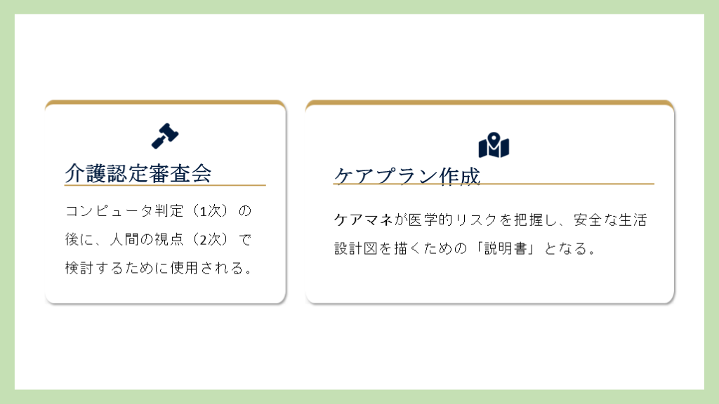 #16. 介護認定審査会 コンピュータ判定(1次)の後に、人間の視点(2次)で検討するために使用される。 ケアプラン作成 ケアマネが医学的リスクを把握し、安全な生活設計図を描くための「説明書」となる。