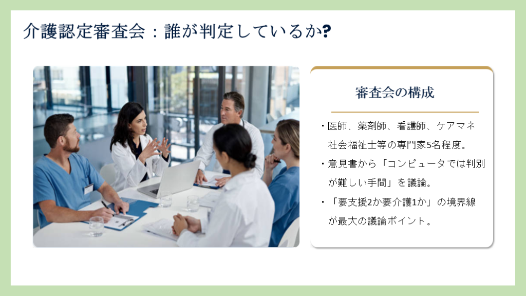 が最大の議論ポイント。 介護認定審査会:誰が判定しているか?