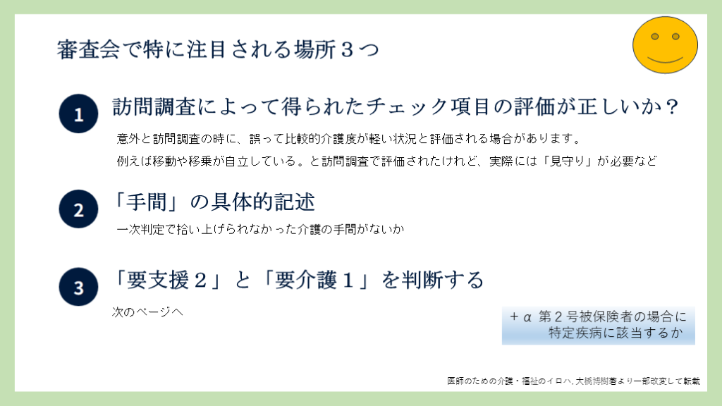 例えば移動や移乗が自立している。と訪問調査で評価されたけれど、実際には「見守り」が必要など 「手間」の具体的記述 「要支援2」と「要介護1」を判断する 審査会で特に注目される場所3つ 一次判定で拾い上げられなかった介護の手間がないか 医師のための介護・福祉のイロハ, 大橋博樹著より一部改変して転載 次のページへ +α 第2号被保険者の場合に