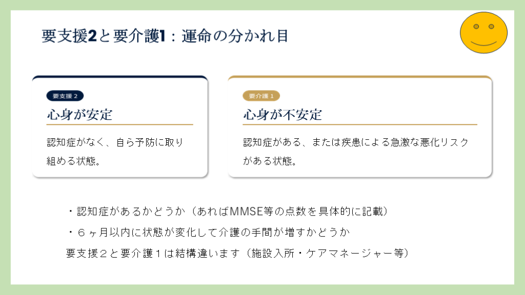 #20. 心身が安定 認知症がなく、自ら予防に取り組める状態。 心身が不安定 認知症がある、または疾患による急激な悪化リスクがある状態。 要支援2と要介護1:運命の分かれ目 ・認知症があるかどうか(あればMMSE等の点数を具体的に記載)
